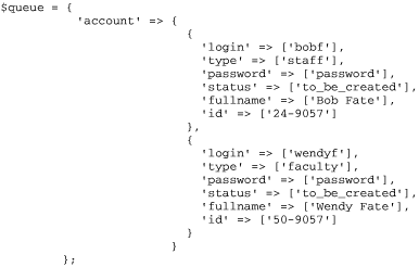 Once the list has been created, the routine iterates through it and requests the value for each field. Each value is then stored back into the record hash. At the end of the question and answer session, a reference to this hash is returned for further processing. Our next step will be to write the information to the add queue. Before we see this code, we should talk about data storage and data formats for our account system.